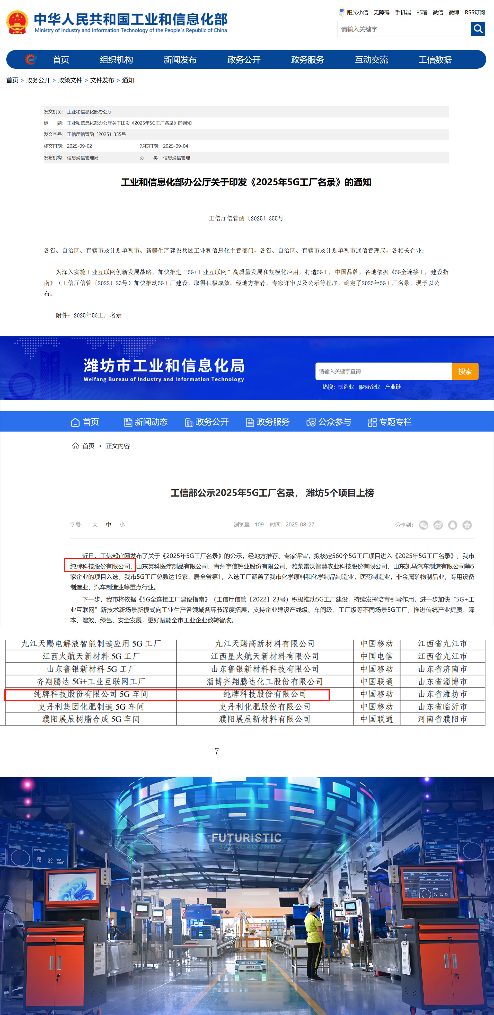 工信部發(fā)文:近日,工信部官網發(fā)布了關于《2025年5G工廠名錄》的公示,經地方推薦、專家評審,擬核定560個5G工廠項目進入《2025年5G工廠名錄》,我市純牌科技股份有限公司、山東英科醫(yī)療制品有限公司、青州宇信鈣業(yè)股份有限公司、濰柴雷沃智慧農業(yè)科技股份有限公司、山東凱馬汽車制造有限公司等5家企業(yè)的項目入選,我市5G工廠總數達19家,居全省第1。入選工廠涵蓋了我市化學原料和化學制品制造業(yè),醫(yī)藥制造業(yè),非金屬礦物制品業(yè),專用設備制造業(yè)、汽車制造業(yè)等重點行業(yè)。